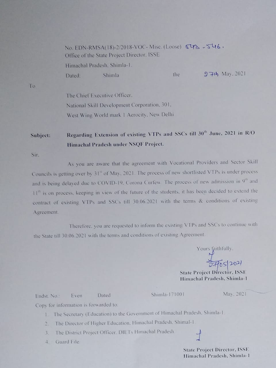 | Regarding Extension of Existing VTPs and SSCs till 30th June 2021 in R/O Himachal Pradesh under NSQF Project. |