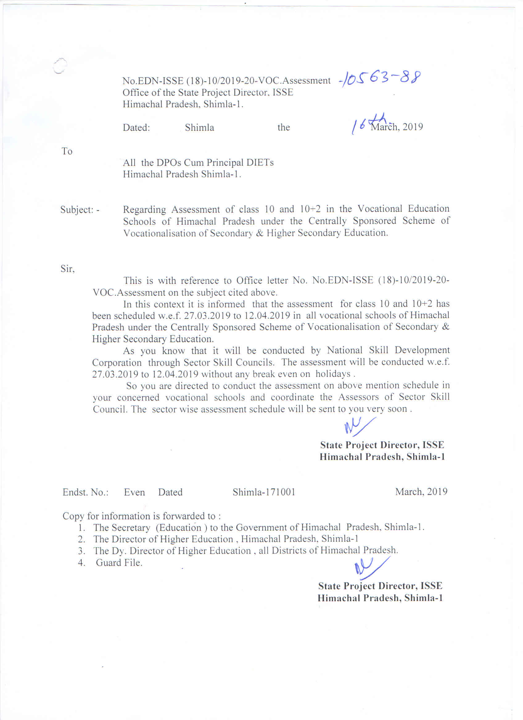 | Regarding Assessment of Class 10th and 10+2 in the Vocational Education Schools of Himachal Pradesh under the Centrally Sponsored Scheme of Vocationalisation of Secondary & Higher Secondary Education |