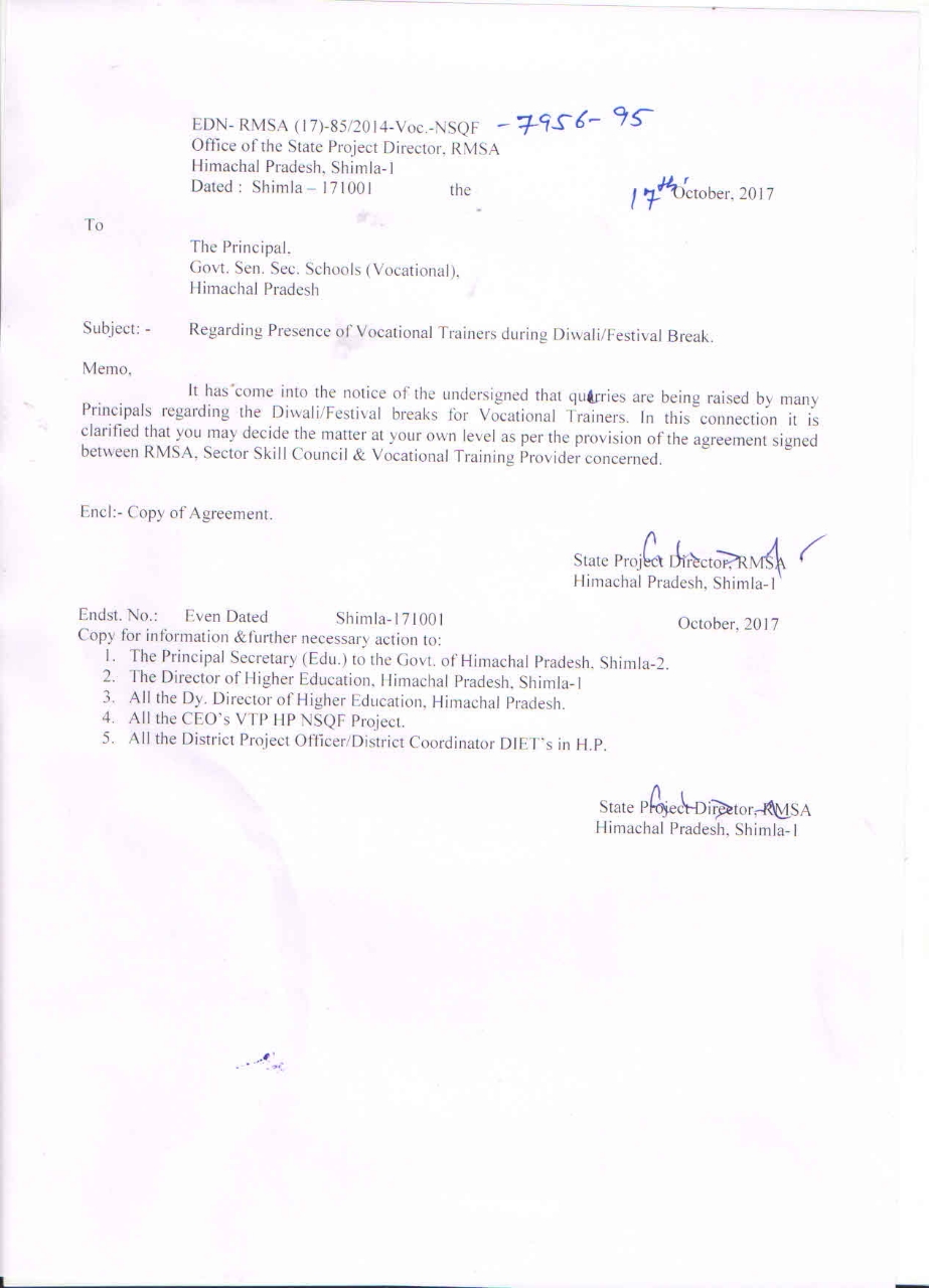 | Regarding Presence of Vocational Trainers during Diwali or Festival Break |